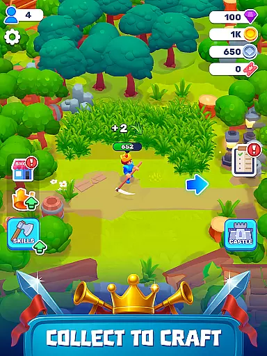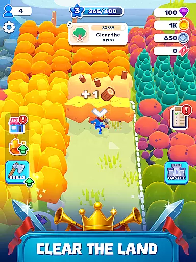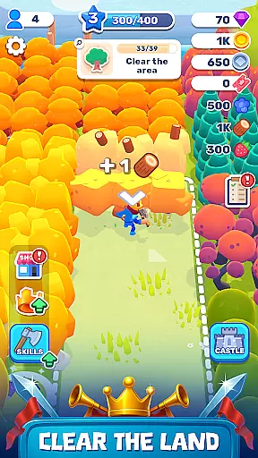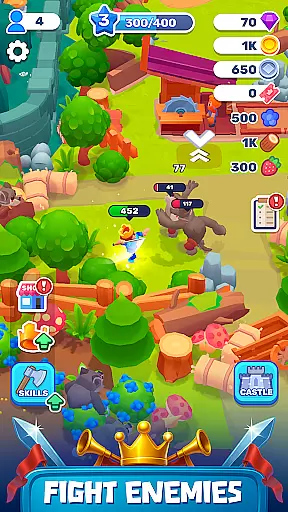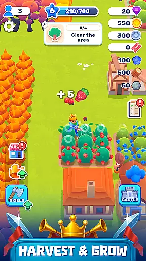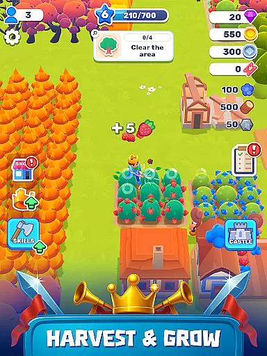 Royal Lands - Save The King is a medieval-themed role-playing game that combines strategy and idle gameplay. Players assume the role of a lowly peasant king, tasked with building a kingdom from scratch. The core function revolves around harvesting resources like wood, berries, and rocks, while managing the growth of your population and army.