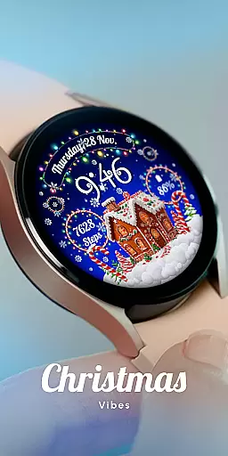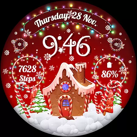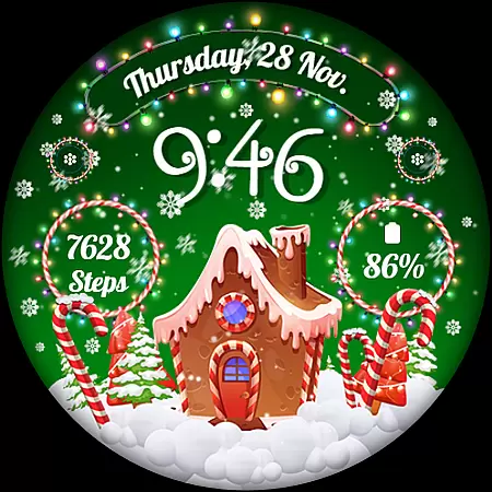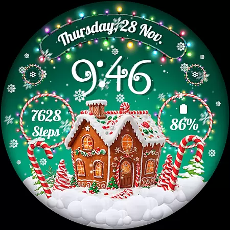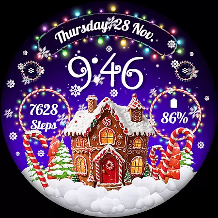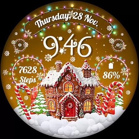 RW01 is a festive Wear OS watch face that brings holiday cheer to your wrist. Featuring animated snow and charming gingerbread houses, it creates a magical Christmas atmosphere. The design includes essential timekeeping elements like 12/24hr digital time, date, and battery indicators.