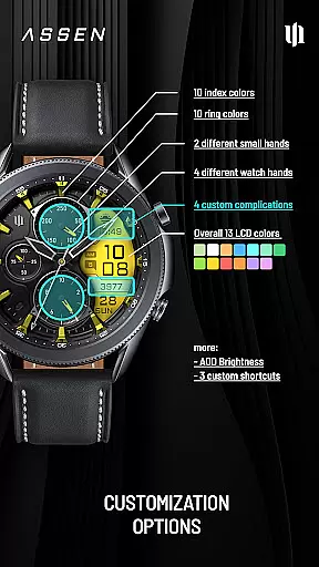 The S4U Assen watch face stands out with its extensive customization options. Users can choose from 13 LCD colors, 10 index colors, and 10 ring colors to match their personal style. The watch face supports 4 different clock hand styles and 2 small hand designs, giving users complete control over the analog appearance.