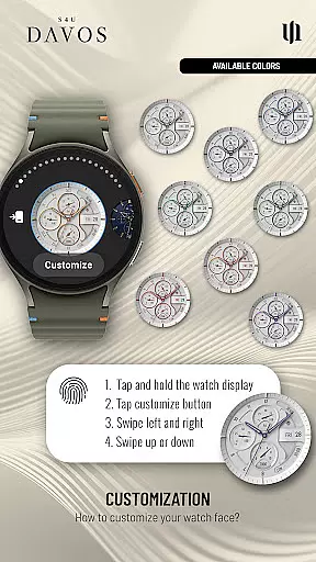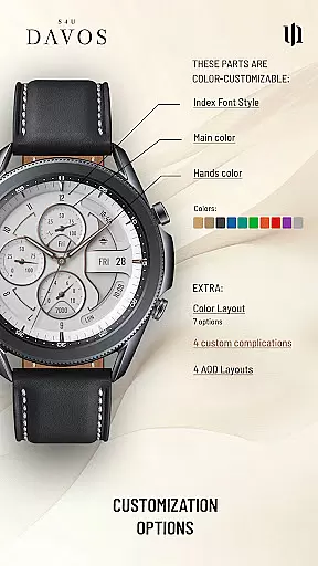 The S4U Davos watch face stands out with its beautifully crafted white analog dial and extensive customization capabilities. Users can personalize the main colors, hands colors, secondary colors, color layout, index font style, and Always-On Display (AOD) layout. These options allow for a unique and tailored appearance that reflects personal style.