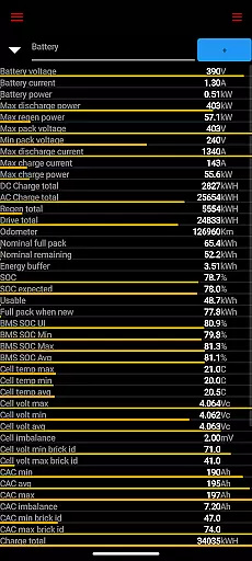 Scan My Tesla stands out with its ability to decode numerous CANBUS packets, giving users access to a wealth of vehicle data. The app provides detailed battery information such as power, voltage, current, and temperature readings, alongside drive unit metrics like electric power, torque, horsepower, RPM, and temperatures.