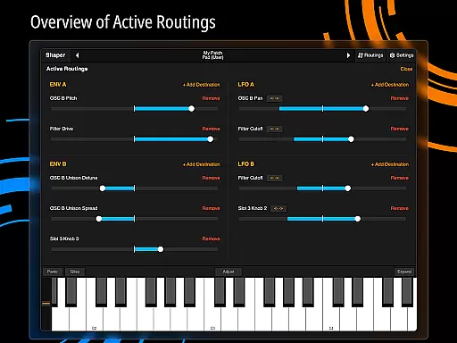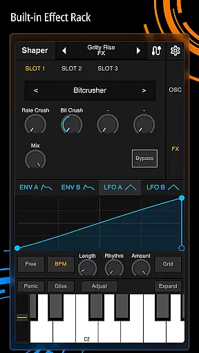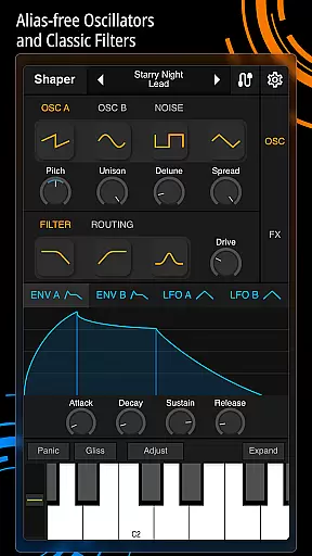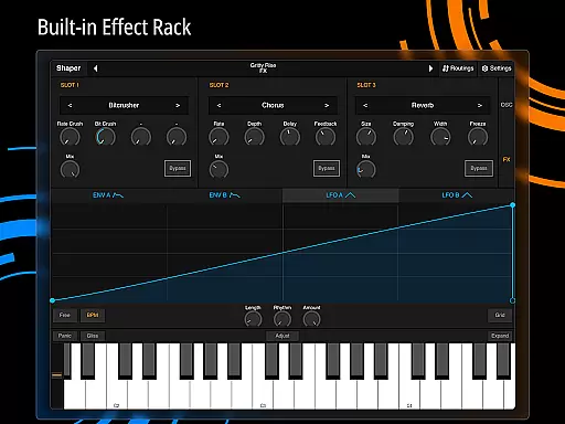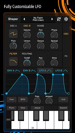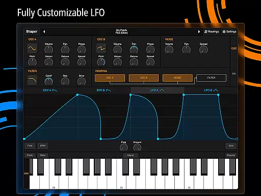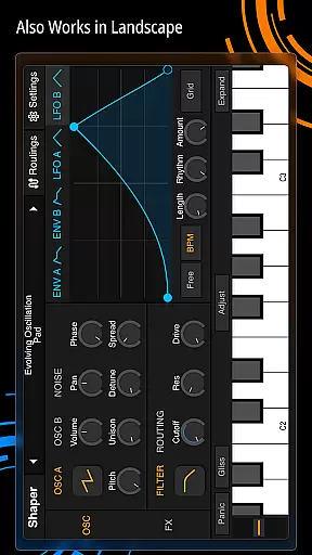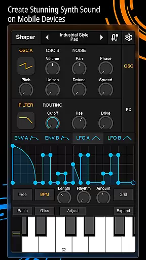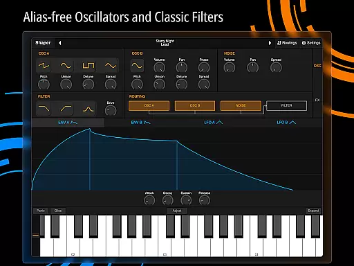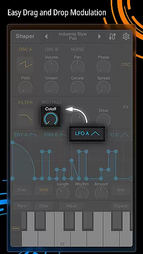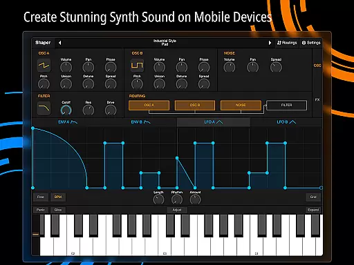 Shaper is a professional-grade subtractive synthesizer designed specifically for mobile platforms. This application empowers musicians and sound designers to craft dynamic sounds through an advanced modulation matrix, configurable LFO graphs, and an intuitive drag-and-drop modulation assignment system.