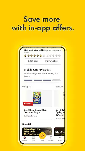 Beyond just showing standard prices, the app highlights additional ways to save. For instance, using mobile payment within the app can earn users extra fuel savings. It also shows how reaching higher loyalty tiers, such as Platinum Status, translates into greater discounts per gallon, providing clear incentives for continued use of the app and loyalty program.