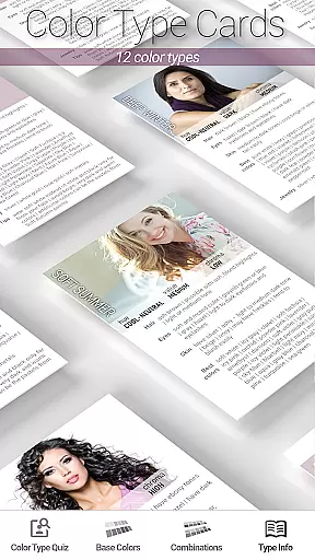 A key feature is the built-in seasonal color analysis quiz that helps users identify their seasonal type. While not a substitute for professional analysis, it offers valuable insights into potential color palettes. Users can explore detailed descriptions of each color type and view full-display pages for individual colors. The app also supports user-defined color cards, allowing for customized color preferences.