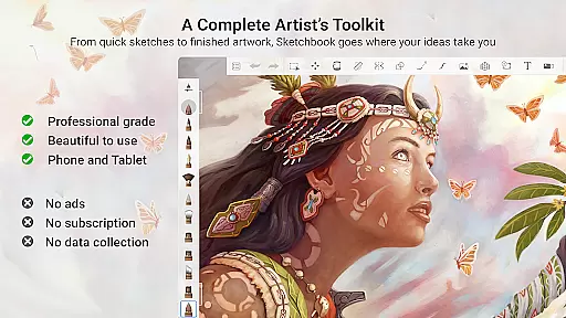 In addition to its impressive brush library, Sketchbook offers tools such as guides, rulers, and stroke controls that support meticulous drawing. The inclusion of layers with a full complement of blend modes enables users to build up complex drawings and experiment with color effortlessly. Purpose-built for sketching, the app's clean and unobtrusive interface ensures that nothing comes between you and your creativity.