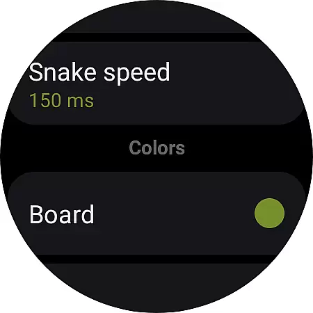 Snake offers multiple features that enhance the classic gameplay while adapting to modern wearable technology. The touch-based controls are specifically optimized for small watch screens, with both swipe gestures and border tapping options available for comfortable gameplay. The app includes essential settings such as wall collision rules that can be customized to players' preferences.