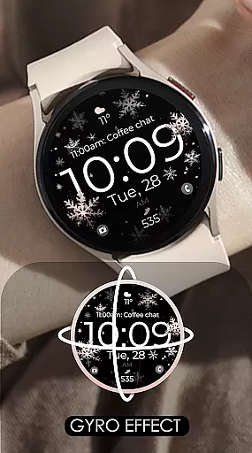The Snowflake Rose Gold watch face stands out with its unique GYRO effect, which brings the snowflake design to life through wrist movements. This feature creates an interactive experience while maintaining a sleek and modern aesthetic. Users can further personalize their watch face by changing the color of the snowflakes, allowing for a customized look that suits individual styles.
