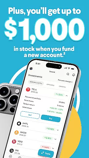 The app provides a checking account with no fees or minimum balance requirements, enabling users to get paid up to two days early through direct deposit. It also includes robust stock trading features, allowing users to trade stocks and ETFs without commission and invest in fractional shares starting at just $5. Additionally, SoFi offers high APY on savings balances, personal loans, credit score tracking, and essential security measures like bank-level encryption and fraud alerts.