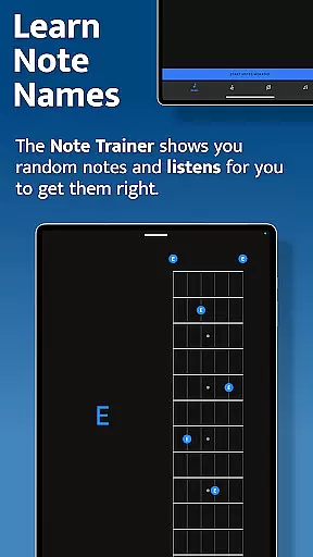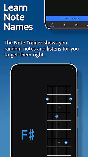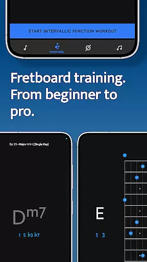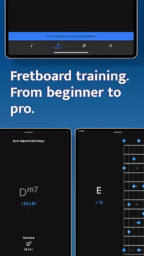 The app features four specialized training modules - Note Trainer, Interval Trainer, Changes Trainer, and Scale Trainer. Each module uses interactive fretboards and listening technology to ensure accurate practice. The app supports various string configurations including 6-string guitars, 7-string guitars, and 4/5-string basses, making it suitable for both beginners and advanced players.