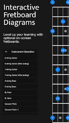 Additional features include interactive fretboard diagrams, customizable practice sessions with duration-based workouts, and support for various tunings. The app's intelligent mapping system listens to user input and provides real-time feedback, ensuring proper technique development. These features combine to create a powerful learning tool that adapts to different skill levels and musical styles.
