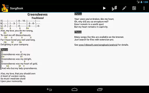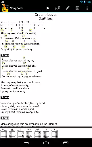 SongBook is a versatile music management app designed for Android tablets and phones. It allows musicians to efficiently organize their song collections, complete with lyrics and chords. The app features comprehensive chord libraries for various instruments including guitar, ukulele, banjo, and piano, which are extensible to fit the user's needs.