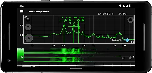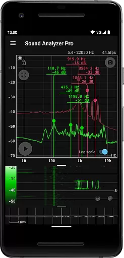 Sound Analyzer distinguishes itself through its comprehensive suite of audio analysis tools. The app's most notable feature is its dual-view system, simultaneously displaying frequency spectra while tracking their temporal changes through the waterfall view. This combination allows users to monitor both instantaneous audio characteristics and their evolution over time.