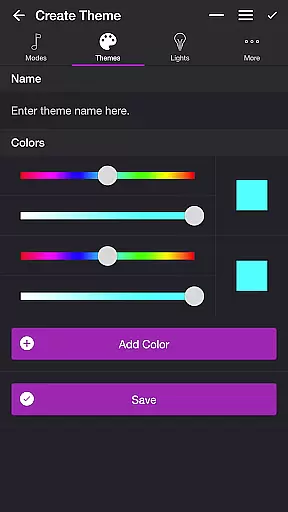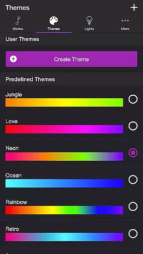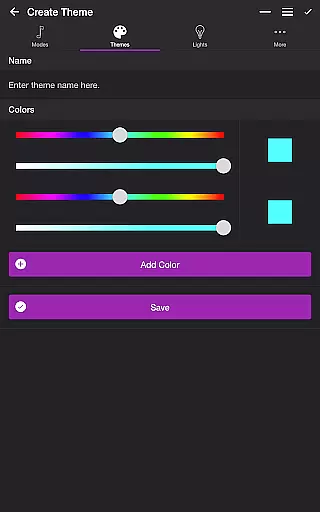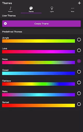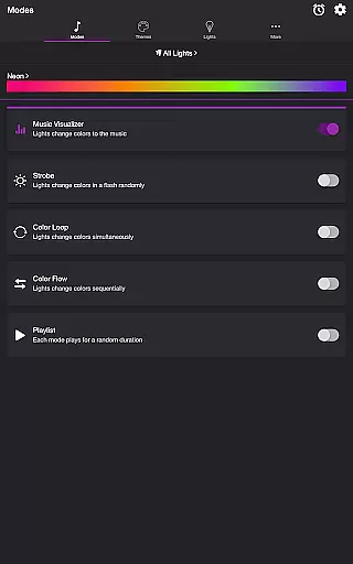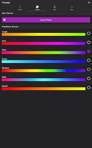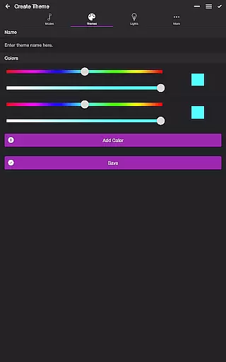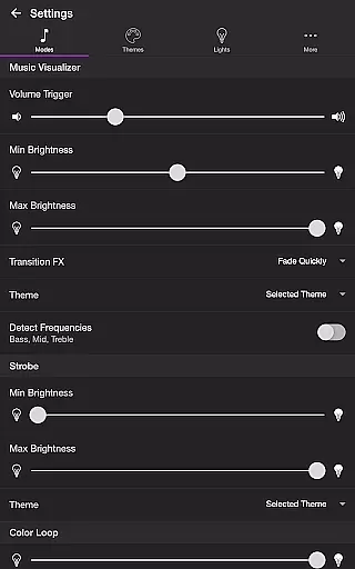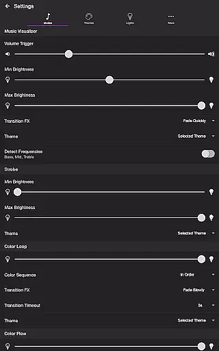 Users can customize each mode with specific settings like brightness levels, transition effects, and frequency detection. Additionally, the Themes tab allows for the creation and editing of custom color schemes, while the Lights tab provides control over individual lights or groups. These features collectively ensure a highly personalized and immersive lighting experience tailored to any occasion.