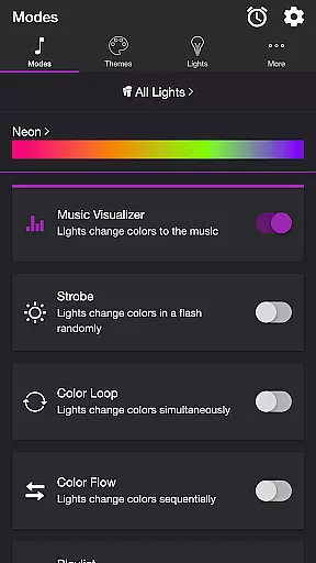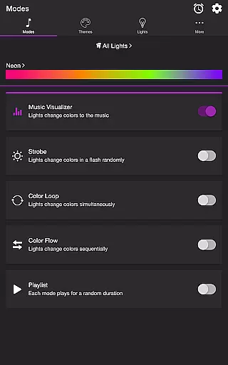 Soundstorm for Hue stands out with its diverse range of features designed to enhance user experience. The app includes multiple modes such as Music Visualizer, which uses the device's microphone to sync lights with music beats, and Strobe, offering random color flashes for a lively ambiance.