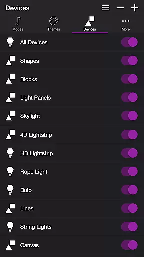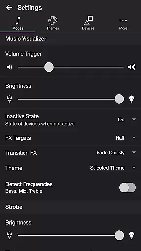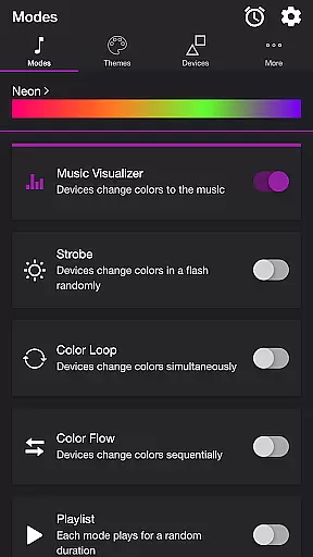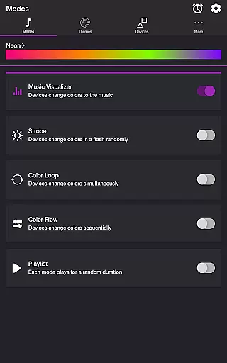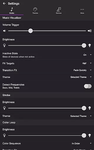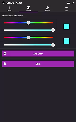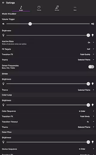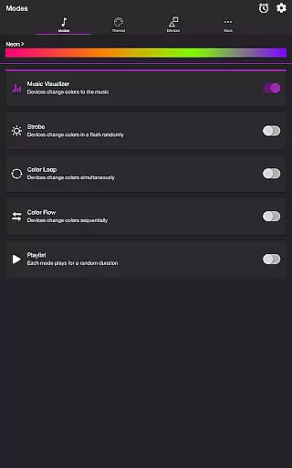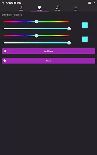 The app's flexibility in theme selection allows users to either pick from predefined themes or create their own, ensuring that the light shows remain fresh and personalized. The ability to reorder colors and customize settings within each mode adds another layer of variety.