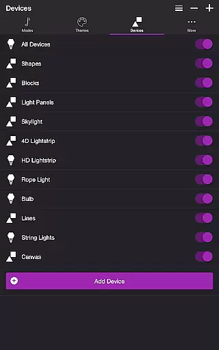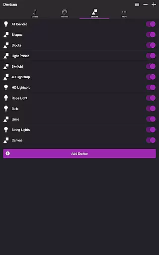 The app offers multiple modes including Music Visualizer, Strobe, Color Loop, Color Flow, and Playlist. Each mode uses advanced algorithms to produce stunning visual effects that dance to the rhythm of the music. Users can customize themes, adjust settings like brightness and transition effects, and control individual Nanoleaf devices.