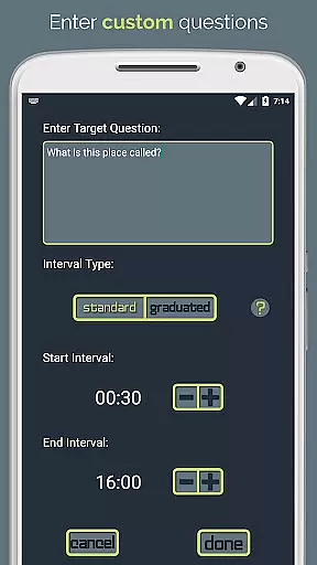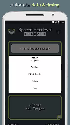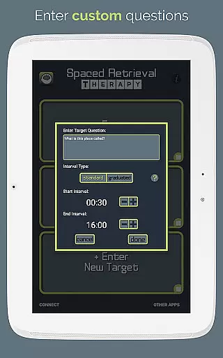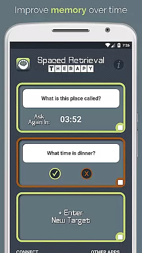 Spaced Retrieval Therapy stands out with its unique features tailored for effective memory training. The app's core functionality revolves around its ability to automatically adjust time intervals between prompts based on the user's responses. Correct answers extend these intervals, reinforcing memory retention, while incorrect responses shorten them, ensuring timely reminders.