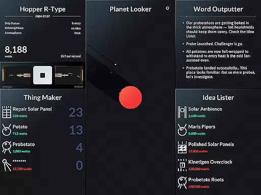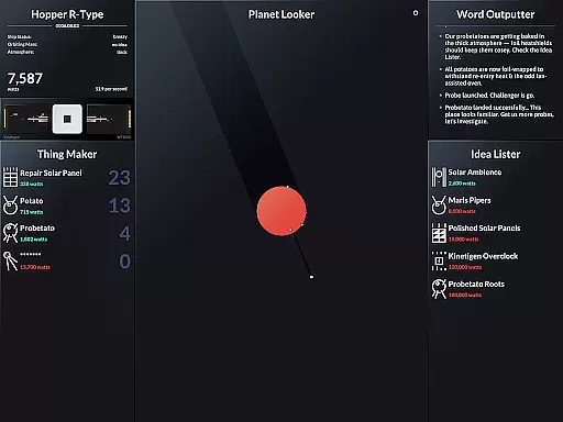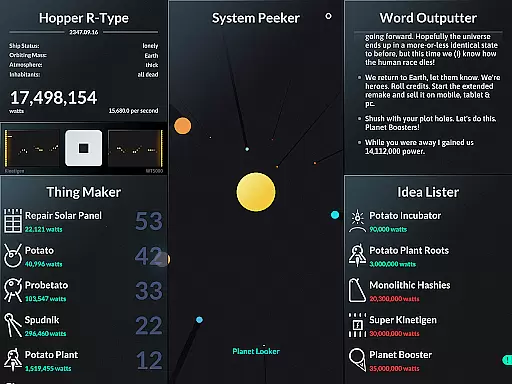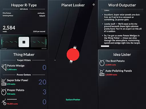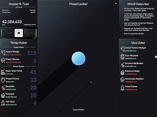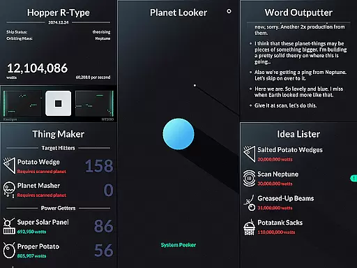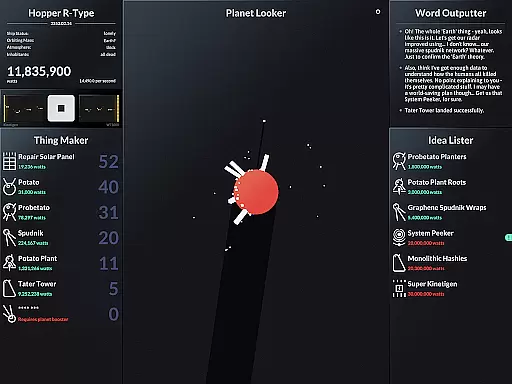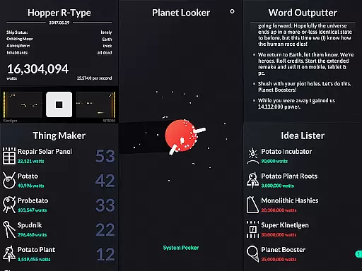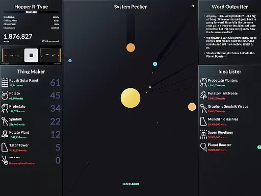 SPACEPLAN is an innovative simulation game that combines narrative storytelling with interactive gameplay. The core function revolves around using manual clicks and time progression to create and launch potato-based devices from a satellite orbiting a mysterious planet. This unique mechanic creates an engaging experience where players can unlock the mysteries of the galaxy while enjoying a silly yet captivating story.