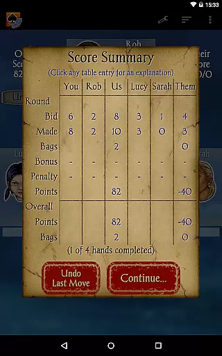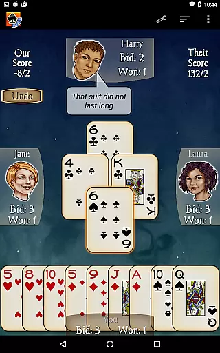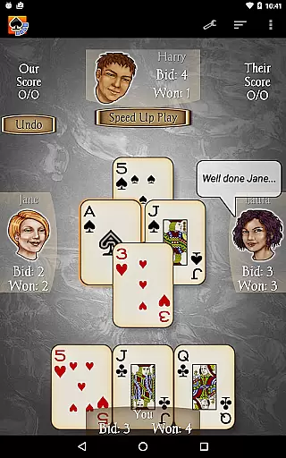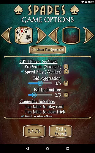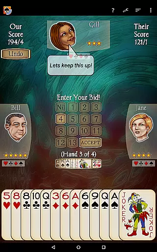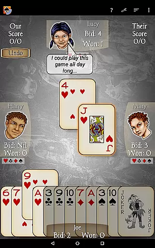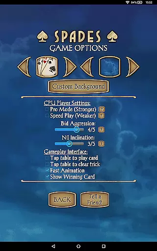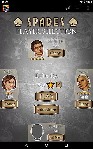 The app includes 21 CPU characters with varying skill levels, from beginner to expert, ensuring a scalable difficulty level for all players. With new features like character chat during play, customizable backgrounds, and detailed player stats, Spades Pro delivers both classy graphics and smooth gameplay. Whether you're playing on a tablet or phone, this app provides a comprehensive Spades experience with options like 'Pro mode' for stronger play and 'Speed Play' for faster games.