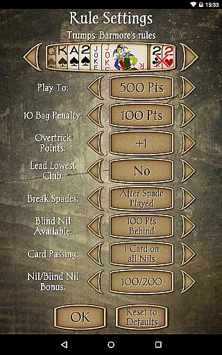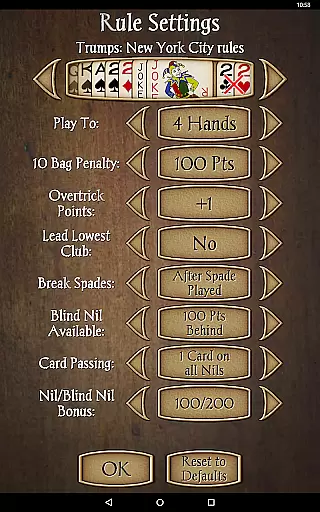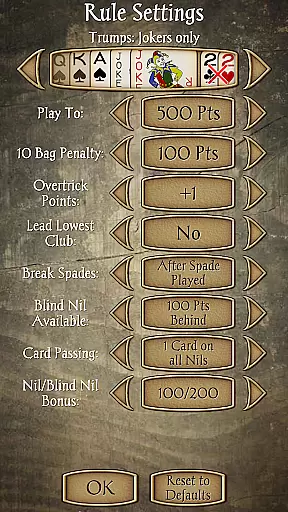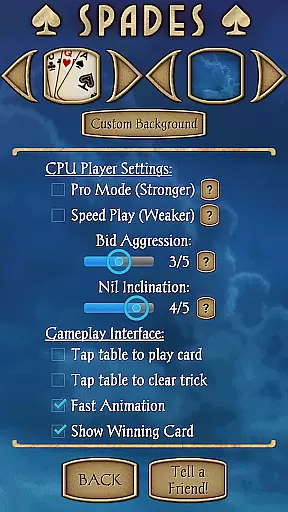 Gameplay options are extensive, including the ability to choose your Spades partner, select from 17 different backgrounds, or even use a custom background. The app supports various rule variations such as Jokers, Barmore, NYC, and Deuces. Additional features like undo, hints, and in-game score explanations make learning and playing more accessible. With options like 'Aggression' mode and real-time rule tracking displays, Spades Pro offers a feature-rich experience that caters to both casual and serious players.