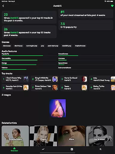 One of the standout features of stats.fm is its ability to display extensive listening statistics without waiting for Spotify Wrapped. The app showcases how many times you've listened to favorite songs, your top genres, and even when you listen most through the listening clock feature.
