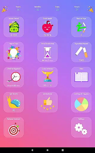 The app includes a countdown timer that tracks health improvements as users abstain from smoking, providing a clear visual representation of the benefits gained. Additionally, the Money Statistics feature shows users how much money they have saved by not purchasing cigarettes, reinforcing the financial advantages of quitting.