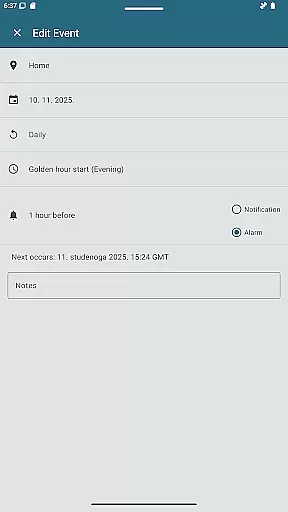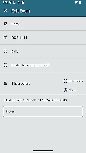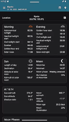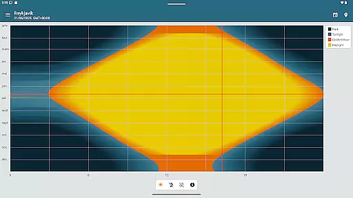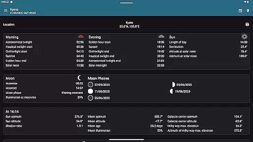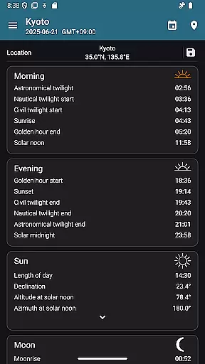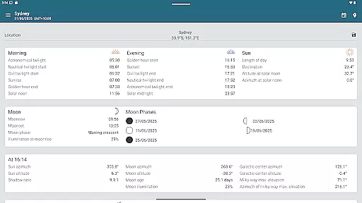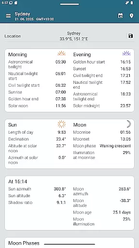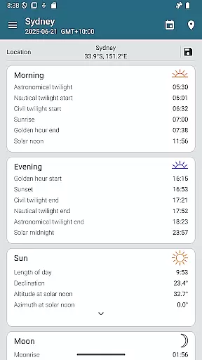 The app offers precise sunrise and sunset times, golden hour, blue hour, twilight stages, moon phases, and more. All these data points are presented clearly, allowing users to plan their activities around natural lighting conditions. This approach enhances the user experience without artificial alterations.