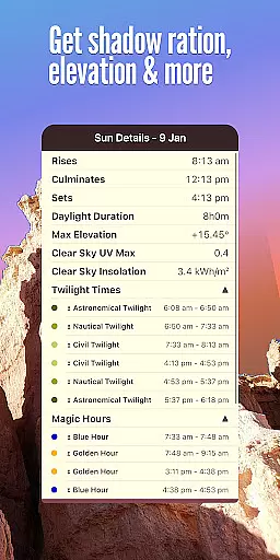 With features like the 3D AR camera overlay, users can visualize the sun's path directly within their device's camera view. This augmented reality feature helps photographers frame their shots perfectly, ensuring they capture the desired lighting effects at the right moment.