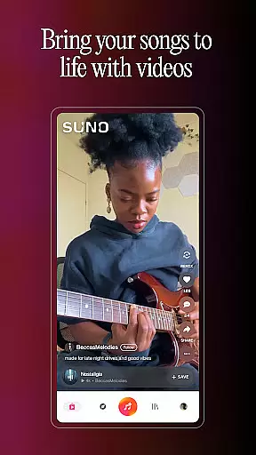 The app's core functionality lies in its ability to create music through various inputs including text prompts, audio recordings, images, and even videos. Users can simply describe their musical idea or provide basic audio elements, and Suno will generate complete compositions. The platform also offers advanced features for lyrics writing, playlist creation, and music discovery, making it an all-in-one solution for music creation and exploration.