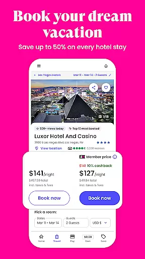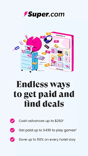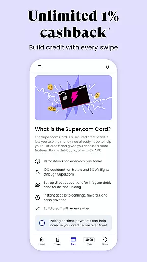 Super.com is an all-in-one financial empowerment app that helps users save money, earn rewards, and manage their finances effectively. The app offers significant discounts on travel bookings, cashback on everyday purchases, credit-building tools, and unique earning opportunities through games and surveys.