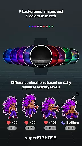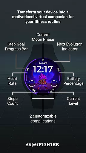 Super Fighter Boy Watch Face offers a comprehensive set of features designed to enhance wearable fitness tracking. The core functionality revolves around training a virtual warrior that evolves based on user activity. This includes detailed step tracking, heart rate monitoring, and physical performance metrics that translate into character progression and visual transformations.