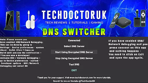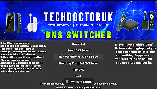 The setup process requires enabling USB or Network Debugging on your device before launching the app. Once configured, TDUK DNS Switcher provides a seamless experience in managing DNS settings, making it an essential utility for tech-savvy users who prioritize digital security.
