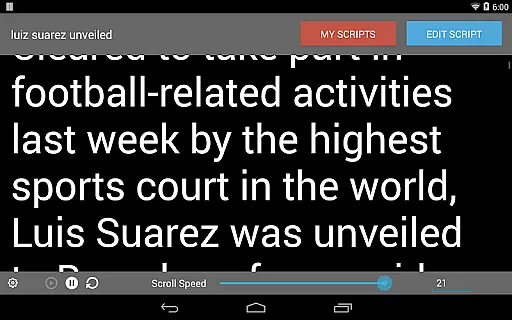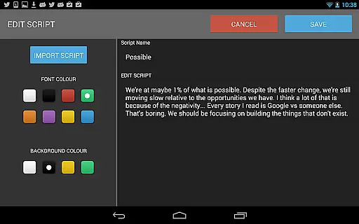 Teleprompter Pro is a professional teleprompter system designed for Android devices, offering users an efficient way to manage scripts during presentations or broadcasts. The app supports unlimited scripts and allows importing from text files, making it versatile for various use cases.