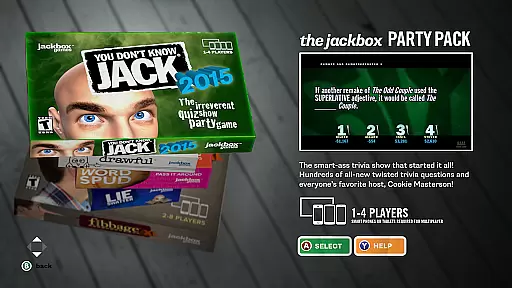 Games include YOU DON'T KNOW JACK 2015, a comedy trivia game for 1-4 players; Fibbage XL, a bluffing game for 2-8 players with expanded content; Drawful, a drawing game for 3-8 players requiring minimal artistic skill; Word Spud, a customizable fill-in-the-blank word game for 2-8 players; and Lie Swatter, a fact-based game for 1-100 players. Each game offers a distinct experience, ensuring fun for all participants regardless of their gaming expertise.