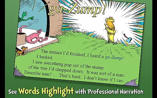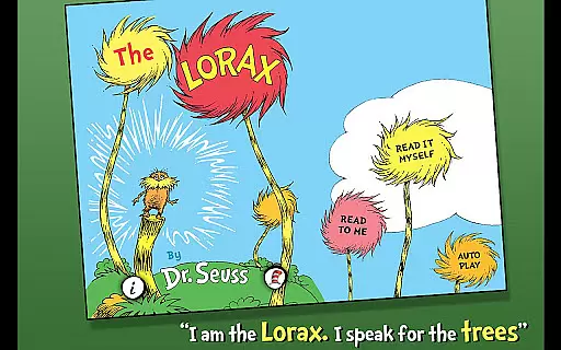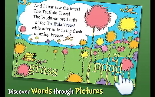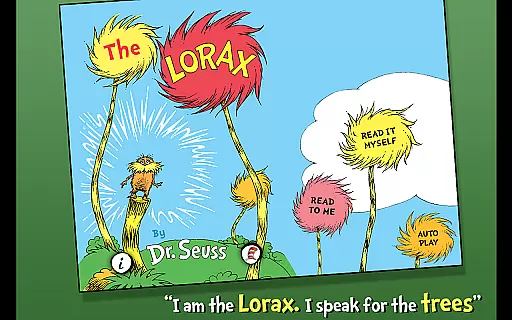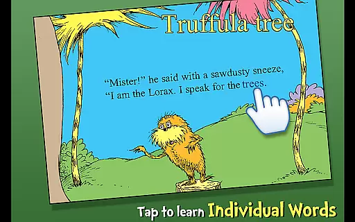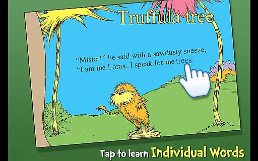 Designed for children ages 3-6, the app offers three fun reading modes, highlighted narration to encourage literacy skills, tappable words to learn new vocabulary, and interactive elements where objects can be tapped to hear their names read aloud. Through vibrant illustrations and captivating storytelling, The Lorax delivers both entertainment and educational value while promoting environmental awareness.