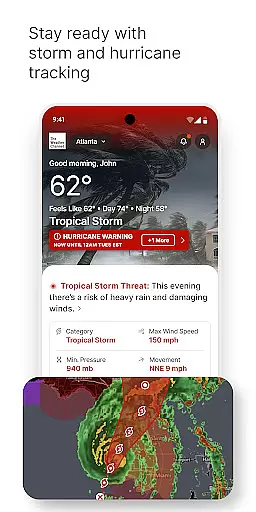 For severe weather, the app provides live hurricane maps, storm radar alerts, and local weather warnings for rain, snow, and more. Users can access detailed forecasts including sunset times, pollen levels, and air quality index. Additional highlights include a weather widget compatible with dark mode and an ad-free premium version with advanced radar and 15-minute forecast details.