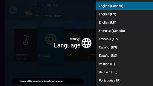 Other notable features include weather, radar, and traffic flow maps with pan and zoom functionality. The app also supports voice search for locations, weather terms, related videos, and photos. Additionally, it offers content in six languages: English, French, Spanish, German, Italian, and Portuguese.