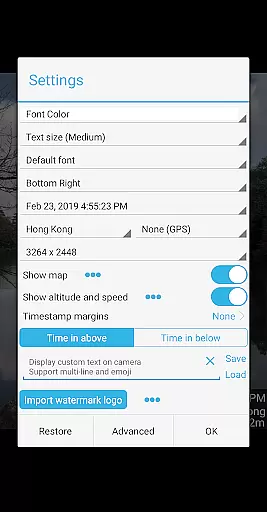 In addition to timestamps, the app provides advanced features such as GPS location tagging, altitude and speed display, custom text overlays, emoji integration, and even map displays with adjustable transparency and scale. Users can also record videos with or without audio, toggle between front and rear cameras during recording, and capture photos while shooting videos. With support for both portrait and landscape modes, direct saving to SD cards, and battery-saving options, this app caters to both casual users and professionals seeking detailed, high-quality media documentation.