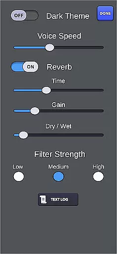 Additional functionalities include a Text Log for reviewing session transcripts, a dark theme for reduced screen brightness, reverb audio effects, and adjustable voice speed settings. Importantly, the app operates independently of external inputs such as sound banks, wordlists, radio signals, internet connectivity, microphone input, GPS data, or sensor data, ensuring a pure and unadulterated communication channel.