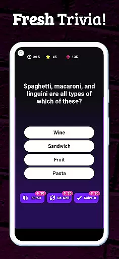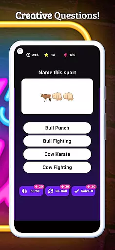A key feature is the app's innovative question formats, moving beyond standard text-based queries to include visual and emoji-based challenges. This variety keeps players engaged and encourages creative thinking. Additionally, the unique hint system offers three distinct options: 50/50 removes two incorrect answers, re-roll provides a new question, and solve it reveals the answer immediately.