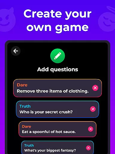 One of the standout features of Truth or Dare - Dirty & Spicy is its vast collection of challenges. With thousands of truth or dare prompts, players can enjoy hours of uninterrupted fun. The app includes multiple categories tailored to different types of groups and events, ensuring that there's always a suitable option available.