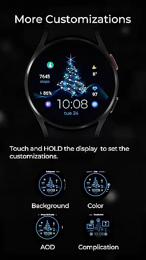 TVV Christmas 2 Watch Face stands out with its comprehensive feature set tailored for WEAR OS users. One of its key highlights is the ability to customize colors and complications effortlessly. Users can simply touch and hold the display, then tap on the customize option to modify settings according to their preferences.