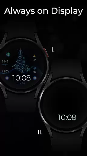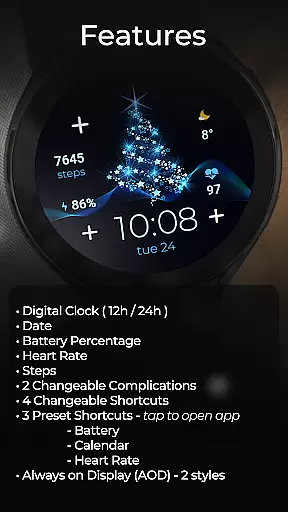 Additional features include two changeable complications and four changeable shortcuts, three of which are preset for quick access to battery status, calendar, and heart rate apps. The Always on Display (AOD) function offers two distinct styles, enhancing usability even when the watch is not actively in use. These thoughtful inclusions make TVV Christmas 2 Watch Face both versatile and user-friendly.