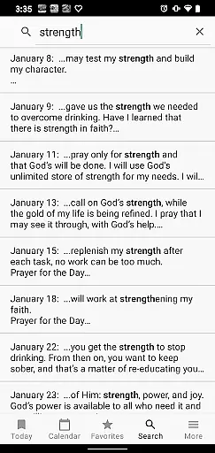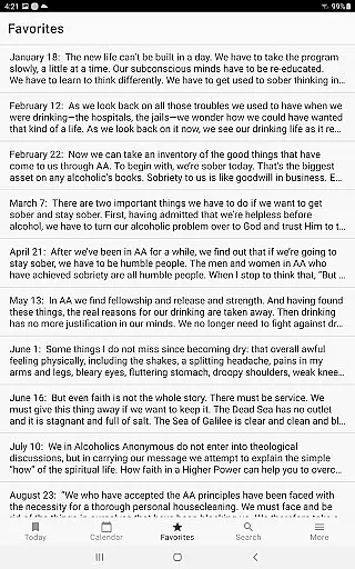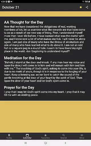 When evaluating digital libraries, the size and authenticity of the content are crucial factors. Twenty-Four Hours a Day offers an extensive collection of 366 daily readings, ensuring users have access to meaningful content every day of the year. This substantial library provides a wide range of meditations, thoughts, and prayers specifically tailored for individuals in recovery from alcohol and other drugs.
