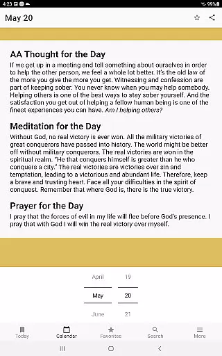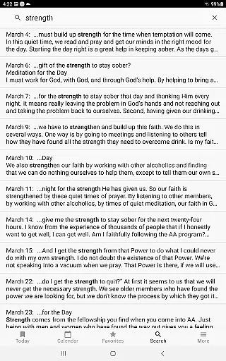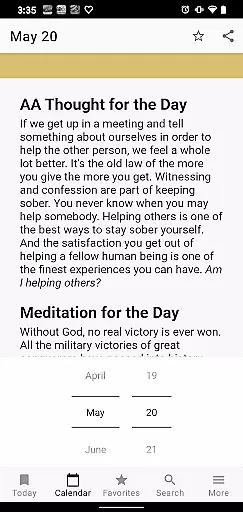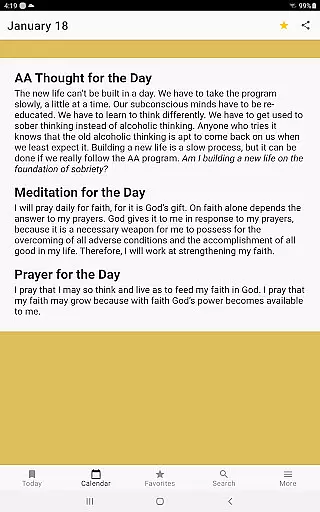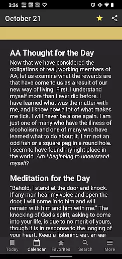 Additional functionalities include bookmarking favorite meditations for easy access later, sharing readings via email or text, and setting daily reminders to read the meditation. Users can also search the entire library of readings, jump to specific dates using the calendar feature, and customize font sizes and display modes (light or dark) according to personal preferences.