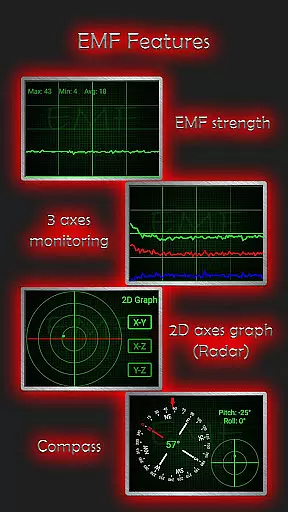 The app's customization options extend to different backgrounds and colors, while extra features such as a radar, compass, and xyz bars enhance the investigative experience. Its adaptive sound indicator on the EMF Advanced mode ensures users never miss a crucial reading during their explorations.
