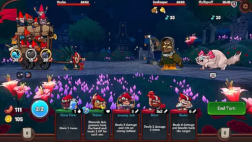 Players can choose from three distinct gnome heroes, each with unique traits, decks, and special abilities. These heroes can be enhanced between runs, allowing for personalized builds that suit individual playstyles. The game features 19 challenging fairy-tale bosses and dozens of regular enemies, each requiring different strategies to defeat.