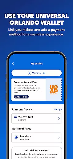 Through the app's integrated Universal Orlando Wallet, users can link their tickets and add payment methods securely. This ensures a seamless and contactless experience, allowing guests to access their tickets on the go and assign specific tickets to members of their travel party with confidence.