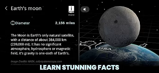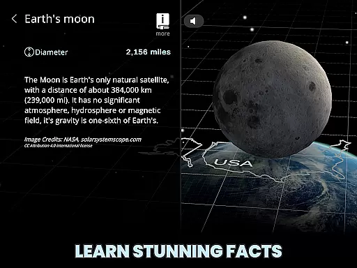In the LEARN segment, users have access to intriguing facts about various objects within the app. For those who prefer auditory learning, the Text-to-Speech feature reads these facts aloud. Additionally, further details are available from trusted external sources, enhancing the educational value and making it an ideal resource for anyone interested in expanding their knowledge about the universe.