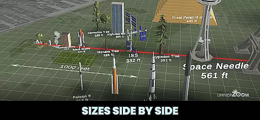 Univerzoom 3D stands out with its UNIVERSAL ZOOM capability, enabling users to control the scale with intuitive gestures. You can zoom out billions of light years to the edge of the known universe or dive into microscopic dimensions, exploring atoms and beyond. The DISCOVER section lets you explore the universe in 3D, offering comparisons between planets, rockets, telescopes, animals, and common items.